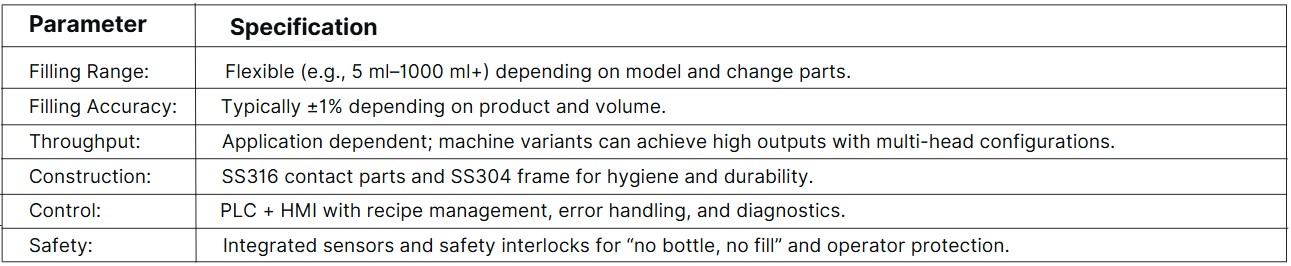 Multi-Format Filling Architecture – Supports both glass and plastic bottles with change part modularity.